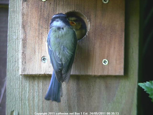 The blue tits have started to feed the chicks through the hole of box 1.
